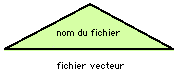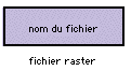 Les diagrammes du modèle graphique respectent à la convention des concepteurs de macros en termes de symbologie. Le modèle est construit avec la sortie à sa droite. Les données et les commandes sont toujours présentés dans les mêmes teintes. Cependant, pour faciliter l'utilisation de ce didacticiel, quand il est imprimé en noir et blanc, chaque type de fichiers est représenté par une forme différente (le concepteur de macros utilise des rectangles pour toutes les données en entrée et différencie les types de fichiers par des couleurs). Les fichiers de données sont représentés comme indiqué sur la figure n°1. Les fichiers rasters sont représentés par des rectangles, les vecteurs par des triangles, les fichiers de valeurs par des ellipses et les feuilles de calculs par des pages au coin droit retournée. Le nom du fichier est inscrit dans le symbole.