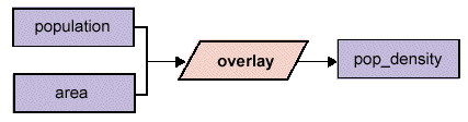 La figure 3 montre un modèle dans lequel deux rasters, surface et population, sont utilisés avec le module OVERLAY (et l'option division) pour produire une image raster de la densité de population.