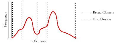 Les niveaux larges et fins de généralisation emploient différentes règles de décision en évaluant les pics de l'histogramme de fréquence. Pour les groupements "larges", un pic doit contenir une fréquence plus élevée que tous ses voisins latéraux. La classification fine permet à une classe d'être centrée sur un pic voisin d'un autre pic ayant une fréquence plus élevée. Ceci s'applique aux pics intermédiaires qui sinon sont masqués par des pics d'une plus grande magnitude. Ce concept est illustré dans l'espace unidimensionnel de la figure 1. Les groupes larges sont séparés par des vallées. Les groupes fins sont divisés par les vallées et par les ruptures de pente de l'histogramme.